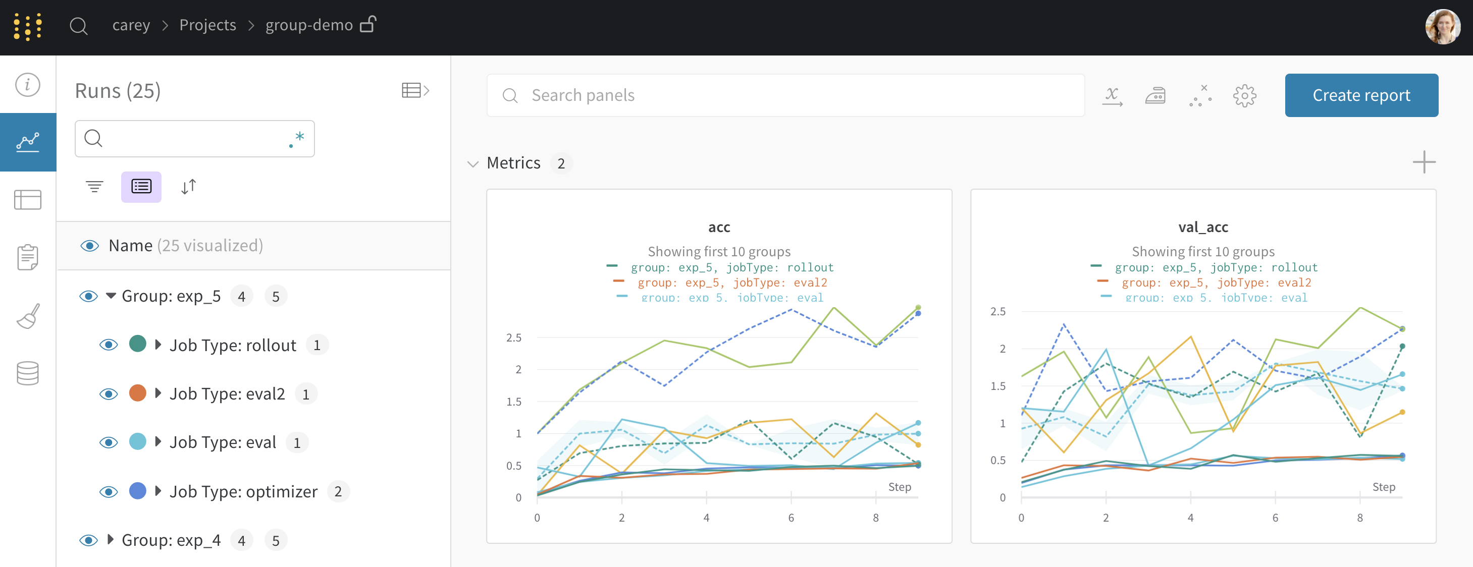 선택적 group 및 job_type 을 wandb.init() 에 전달합니다. 이렇게 하면 각 experiment 에 대한 전용 그룹 페이지가 제공되며, 여기에는 개별 Runs 가 포함됩니다. 예를 들면 다음과 같습니다.wandb.init(group="experiment_1", job_type="eval")
